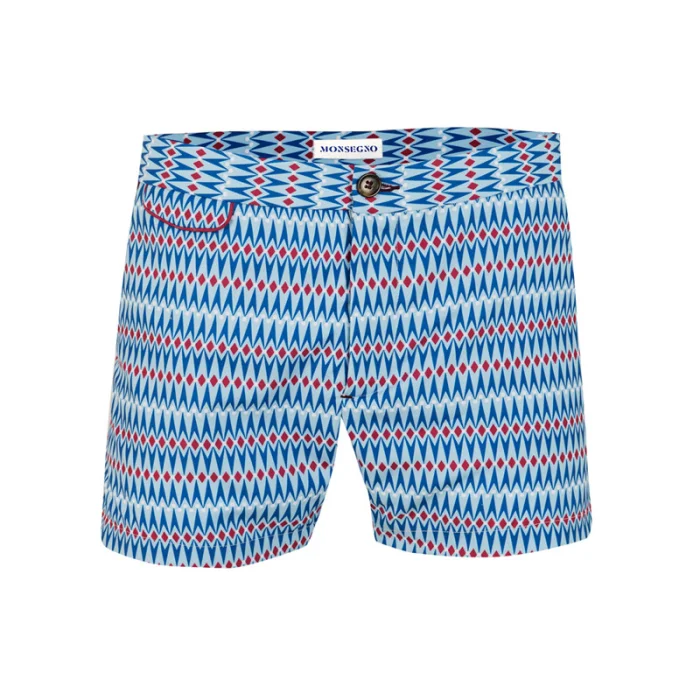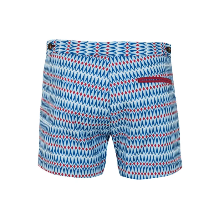 Adjustable side fasteners,bias along side pockets, fleted back pocket, slim fit swimshort.