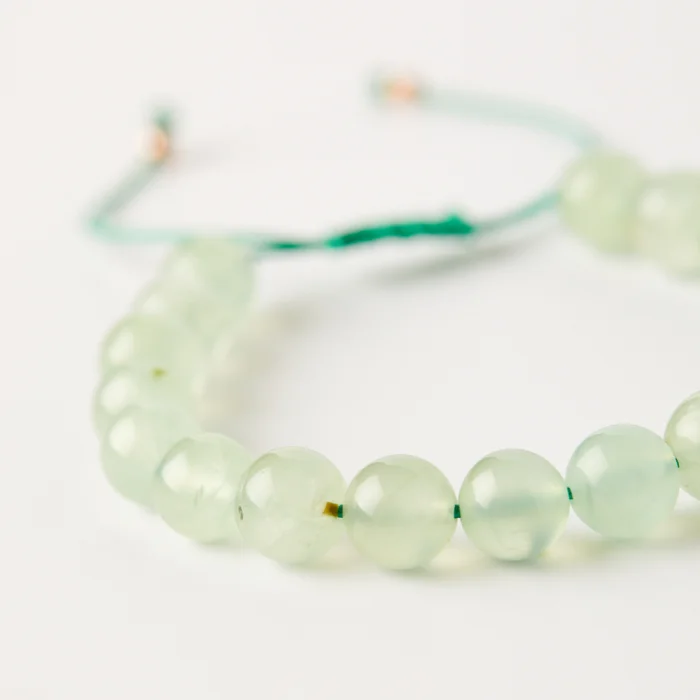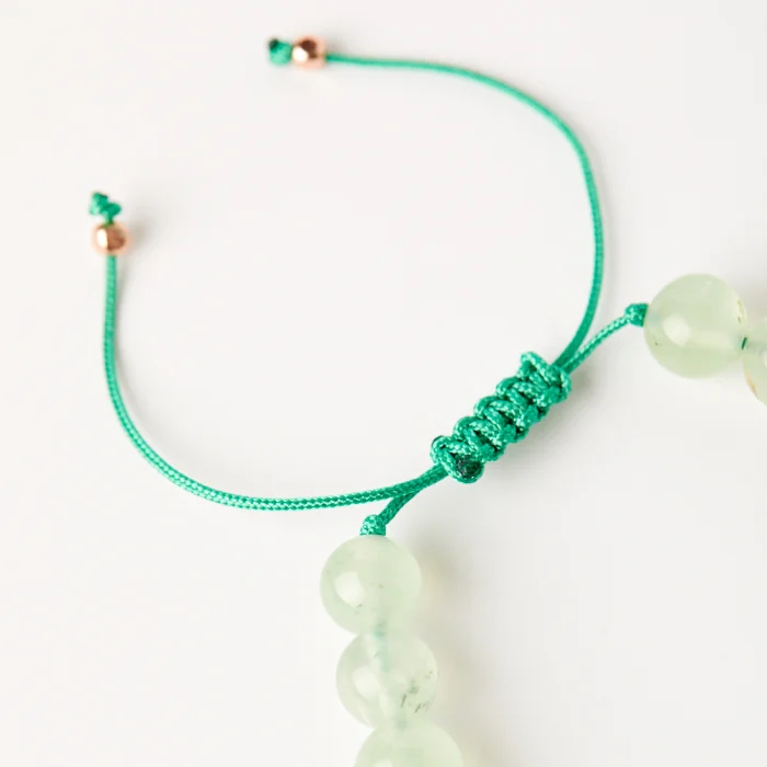 Our beautiful bracelet is meticulously hand-crafted with 18 Prehnite stone beads on a green rope, with an adjustable accordion knot for the wrist. The metal tiny complements on the accordion end are gold-plated brass materials.