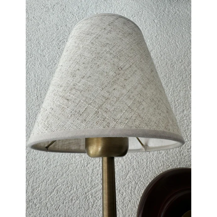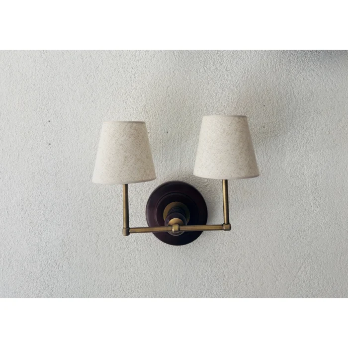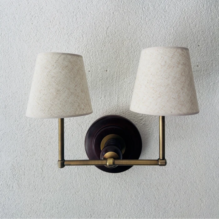 Twin sconces are a unique lighting and wall décor with brass pieces, linen fabric lampshade and natural wood details.