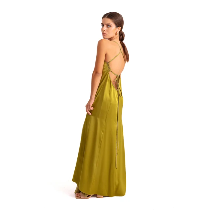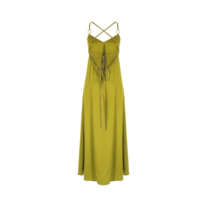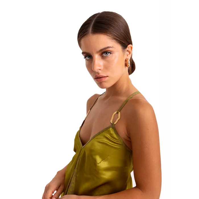 •V-neck front featured with a color block on front and back center. •Adjustable straps detailed with gold metal accessories. •Lace up deep V cut back. •Soft silky vegan fabric.