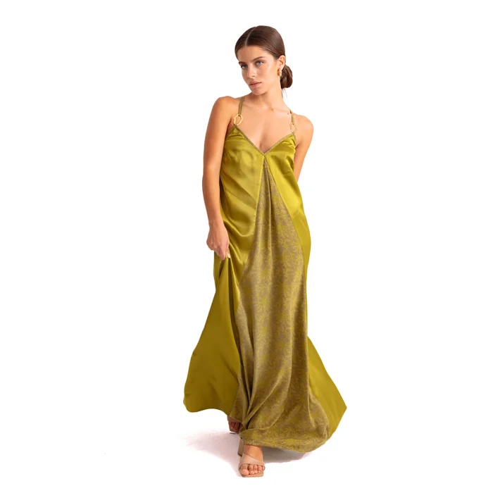 •V-neck front featured with a color block on front and back center. •Adjustable straps detailed with gold metal accessories. •Lace up deep V cut back. •Soft silky vegan fabric.
