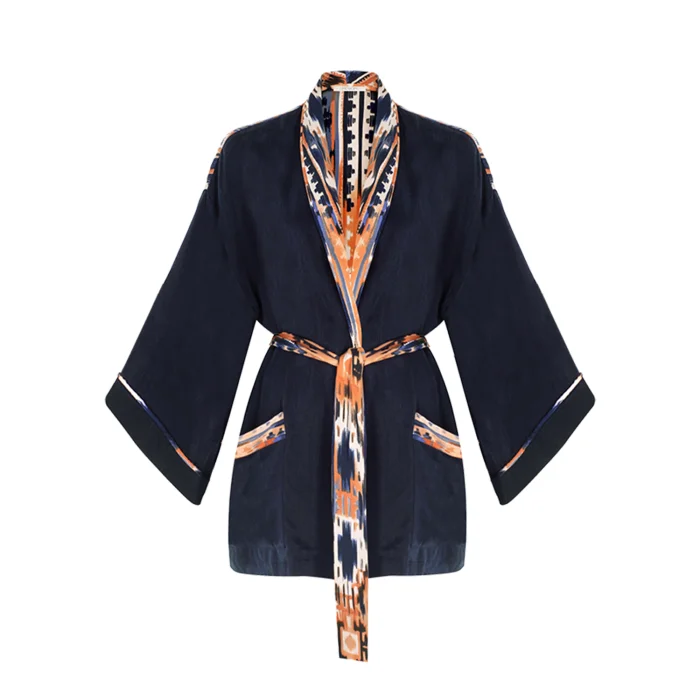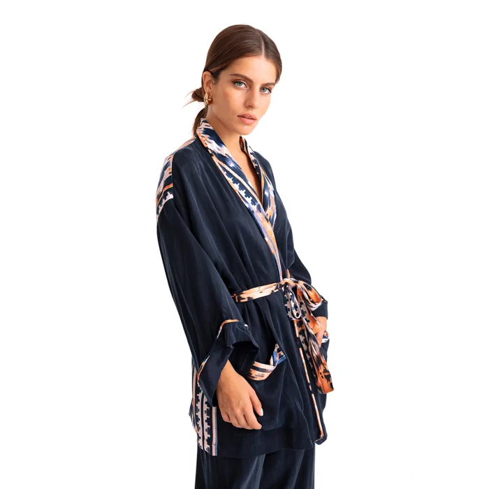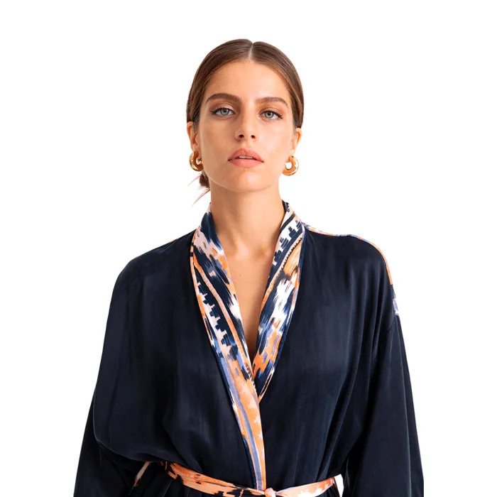 •Long bat sleeved robe with belted waist. •Full length 75 cm from the neck. •Soft silky vegan fabric.