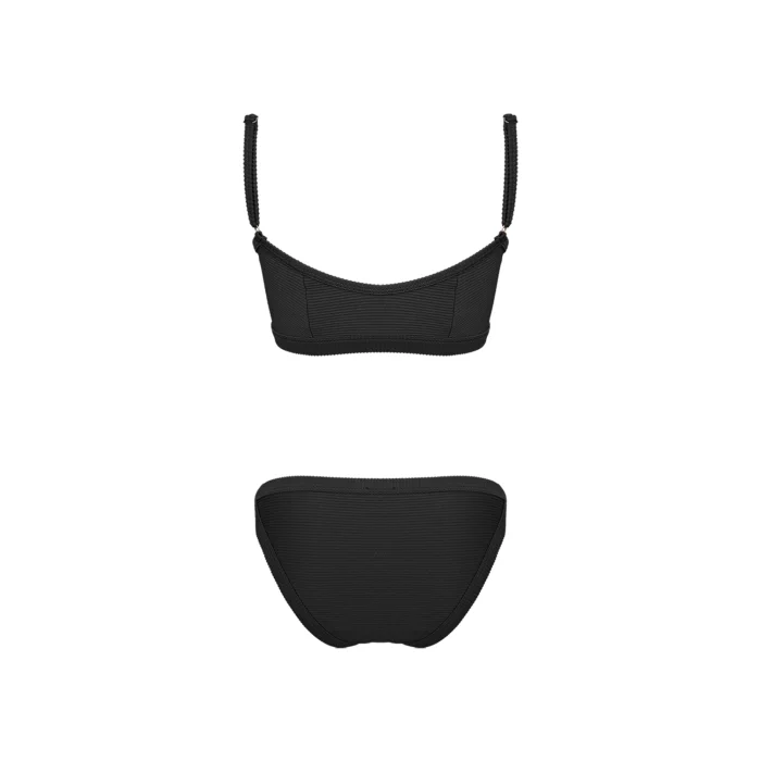 •Structured corset with fused binding oftextured ribbed fabric. •Lace up front with light gold eyelets,featured with adjustable thin straps. •Smooth stretch lining for extra comfort. •Binded bikini bottom with adjustableside tabs.