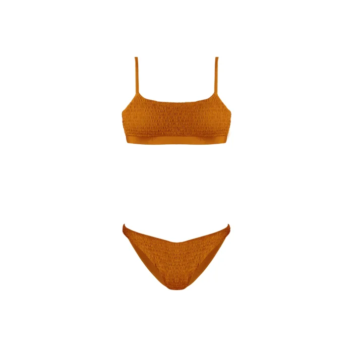 Smock textured bandeau style top with adjustable straps. Classic bikini bottom. Smooth stretch lining for extra comfort. Removable push up paddings.