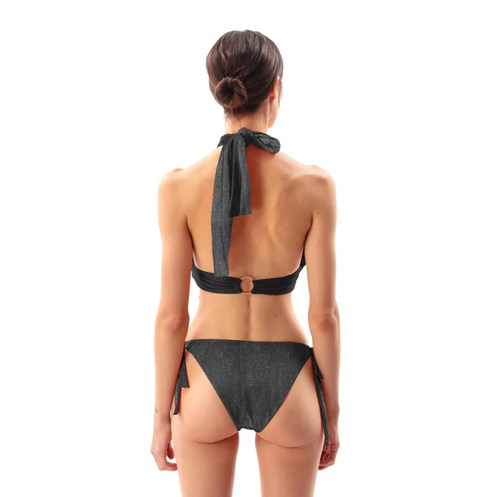 •Cross barbell bikini top tied at the neck. • It can be tied to the gold ring at the neck or back. • Drawstring ring detailed band under the bust and back. • Designed with color blocks. •Bikini bottoms with side ties and a high leg cut. • Made of soft fluffy fabric and terry textured patterned fabric. • Lined for extra comfort. • Removable sponge containers are available. • Made from 86% Polyamide, 14% Elastane. • The product size worn by the mannequin in the picture is size S (36). • Model dimensions: 89/61/92 Height: 1.79 cm