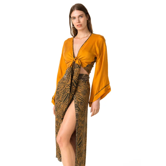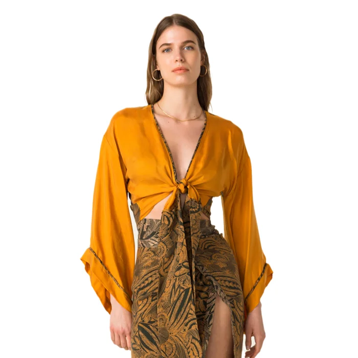 •Tie front style crop top. •Featuring wide sleeves. •Can be worn as envelope style by wrapping around on waist. •Soft silky vegan fabric.