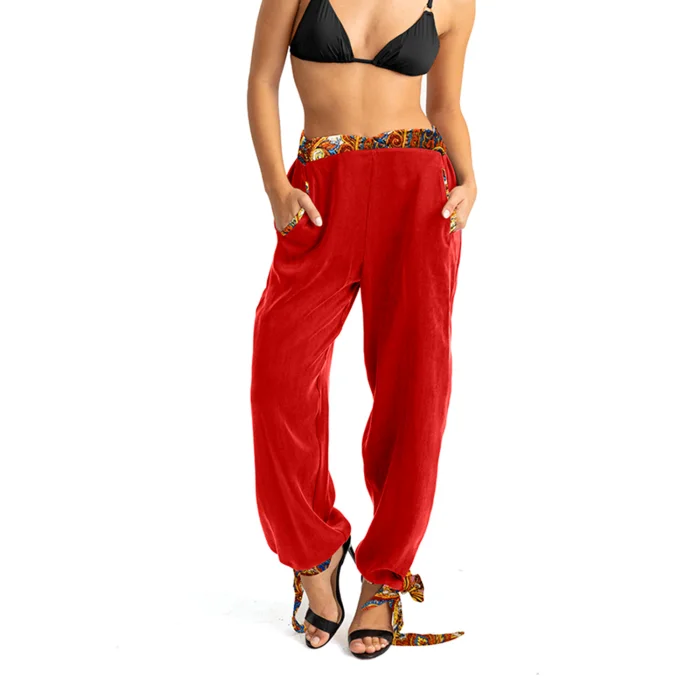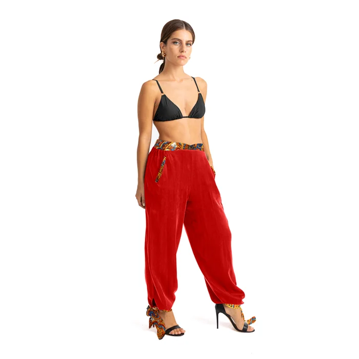 •Pull on pants. •V cut waist is covered with elastic band. •Cuffs are self tied on wrists. •Has hip pockets on the side for comfortable wear. •Soft silky vegan fabric.