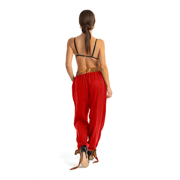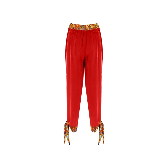 •Pull on pants. •V cut waist is covered with elastic band. •Cuffs are self tied on wrists. •Has hip pockets on the side for comfortable wear. •Soft silky vegan fabric.