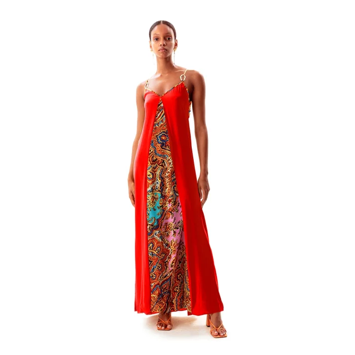 •V-neck front featured with a color block on front and back center. •Adjustable straps detailed with gold metal accessories. •Lace up deep V cut back. •Soft silky vegan fabric. • The product size worn by the mannequin in the picture is size S. • Model dimensions: 83/58/90