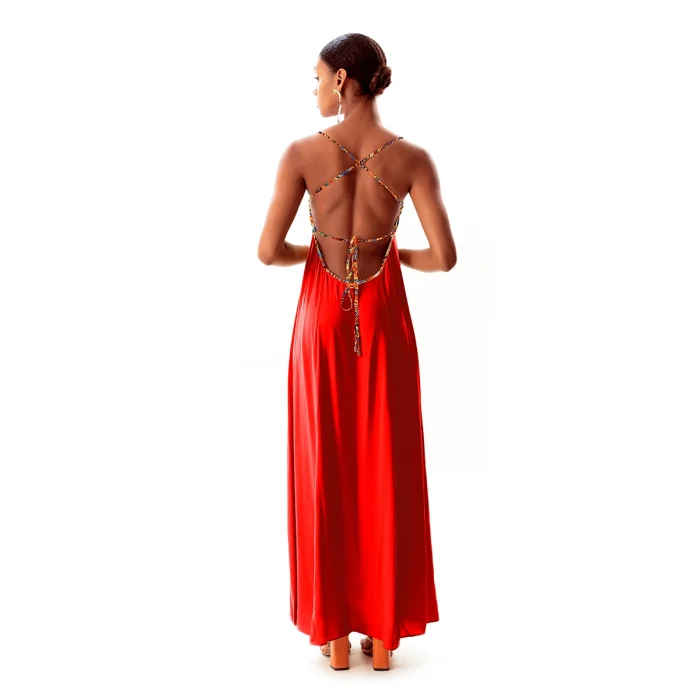 •V-neck front featured with a color block on front and back center. •Adjustable straps detailed with gold metal accessories. •Lace up deep V cut back. •Soft silky vegan fabric. • The product size worn by the mannequin in the picture is size S. • Model dimensions: 83/58/90