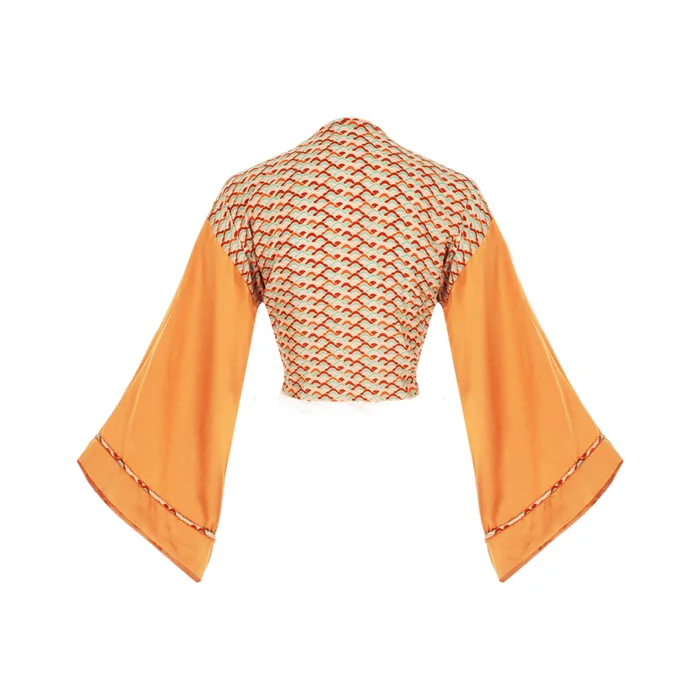 •Tie front style crop top. •Featuring wide sleeves. •Can be worn as envelope style by wrapping around on waist. •Soft silky vegan fabric.