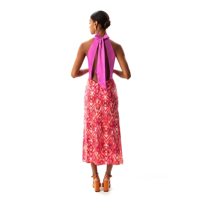 •Tie-neck gown. •Open back. •Adjustable bow at the neck •Side slit.. •Color blocked on neck and back. •Ankle length. •Soft silky cupro fabric. • The product size worn by the mannequin in the picture is size S. • Model dimensions: 83/58/99