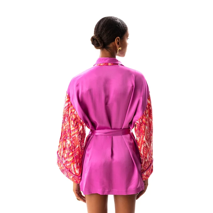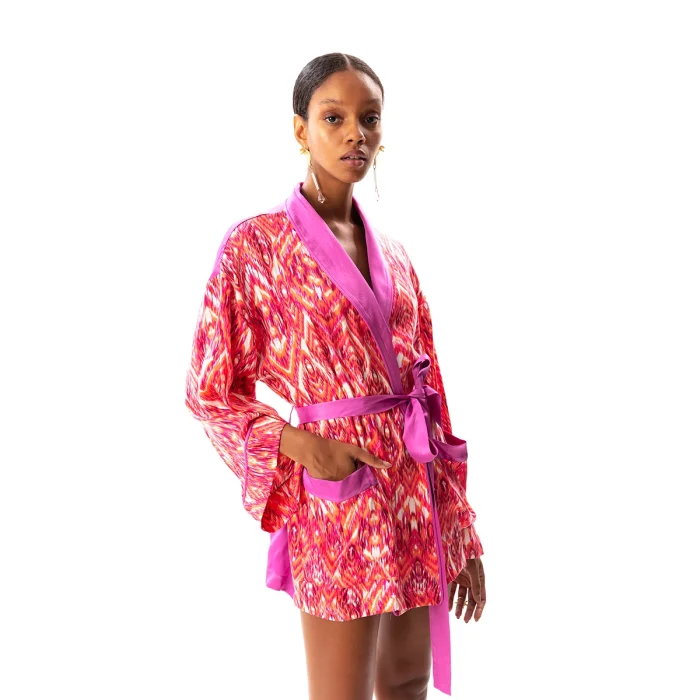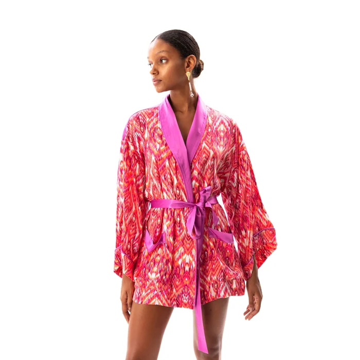 •Long bat sleeved robe with belted waist. •Full length 75 cm from the neck. •Soft silky vegan fabric.