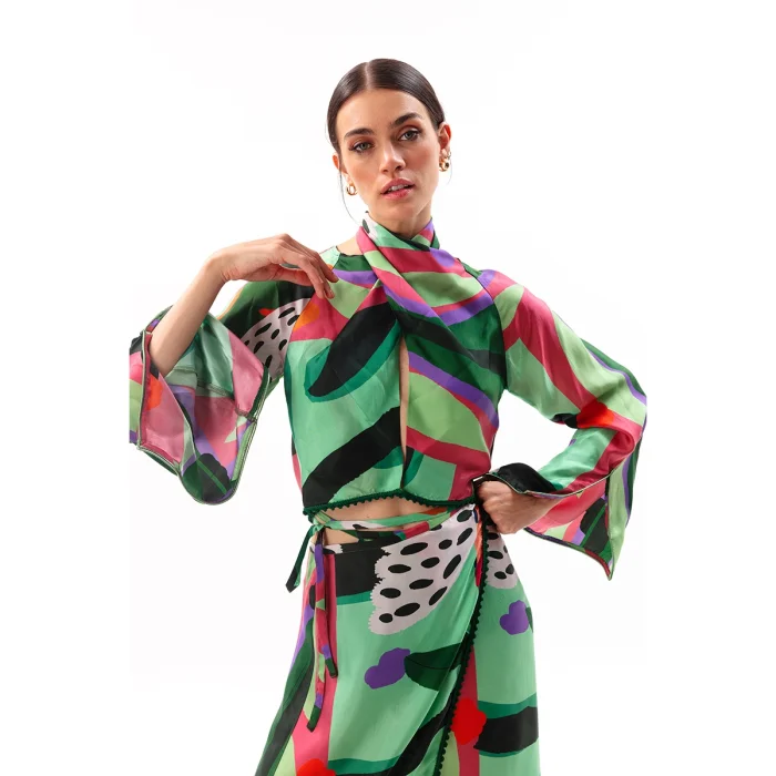 • A jacket with a slit with Spanish sleeves is worn tied at the neck. • Crop top boy. • Pompom and edge decoration details. • Medium-weight construction. • Silky fabric does not sweat, breathes, high comfort is guaranteed. • 100% Cupro. • The product size worn by the mannequin in the picture is size XS/S (34/36). • Model dimensions: 89/61/92, Height: 1.79 cm Fabric information: This garment is made from all-natural ingredients and the highest quality Vegan fabric Oeko Tex 100 Certified Vegan Fabric 100% Recyclable & Sustainable This carbon-footprint-free material is made with an innovative vegan textile process that ensures no animal materials from start to finish.