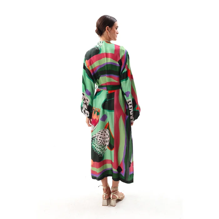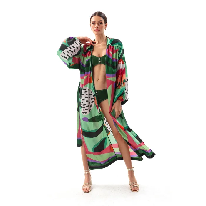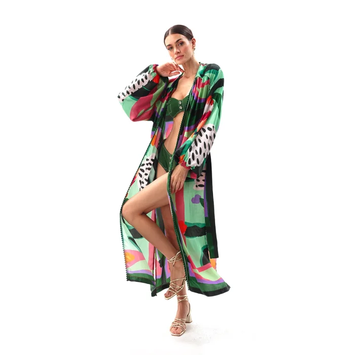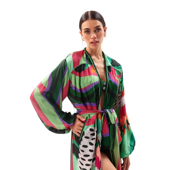• Wide arm flywheel detailed. • Belted waist detail. • Pompom and edge decoration details. • Waist belted. • Medium-weight construction. • Silky fabric does not sweat, breathes, high comfort is guaranteed. • Full length 135 cm from the shoulder. • 100% Cupro • The product is one size. • Model dimensions: 89/61/92, Height: 1.79 cm. Fabric information: This garment is made from all-natural ingredients and the highest quality Vegan fabric Oeko Tex 100 Certified Vegan Fabric 100% Recyclable & Sustainable This carbon-footprint-free material is made with an innovative vegan textile process that ensures no animal materials from start to finish.