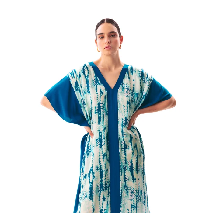 •Side slit details. •Maxi length. •Bath sleeved. •Color blocked. •One size. •Lightweight construction. •Soft silky cupro fabric.