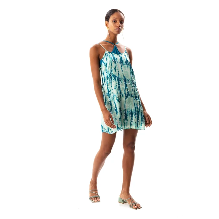 •V neck slip dress. •Gold ring detailed halter dress. •Can be worn together or individually. •Thin stapped. •Mini dress. •Lightweight construction. •Soft silky cupro fabric.• The product size worn by the mannequin in the picture is size S. • Model dimensions: 83/58/94
