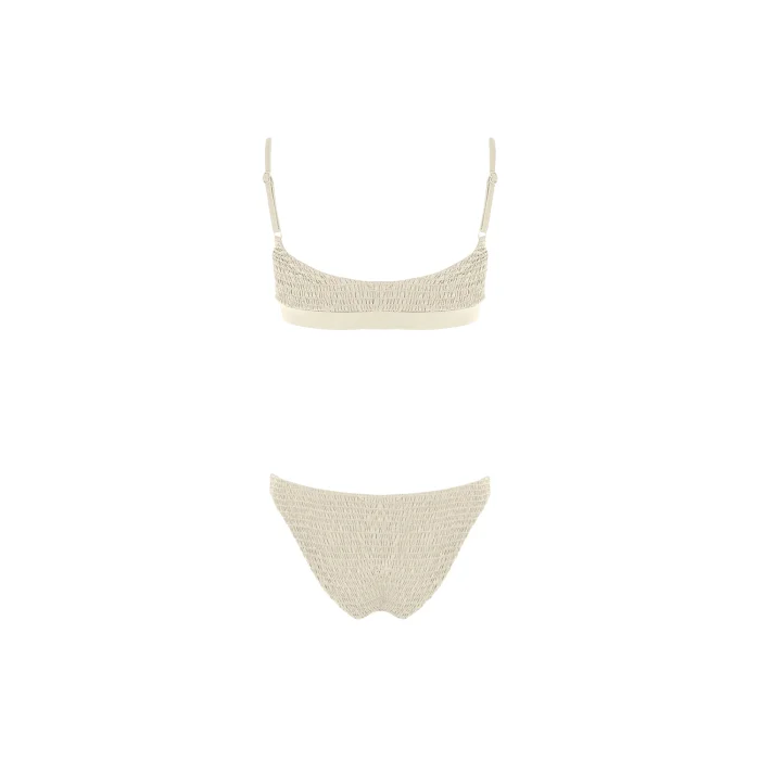 •Smock textured bandeau style top with adjustable straps. •Classic bikini bottom. •Smooth stretch lining for extra comfort. •Removable push up paddings.