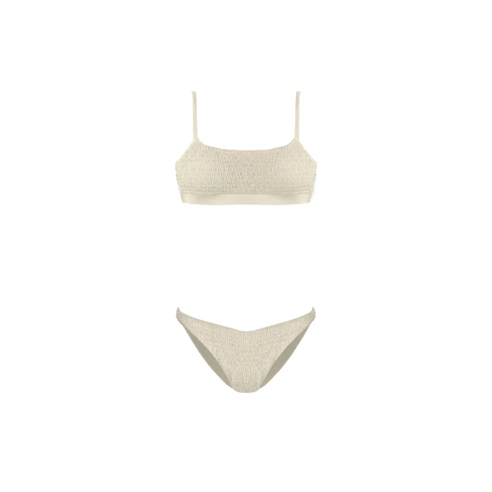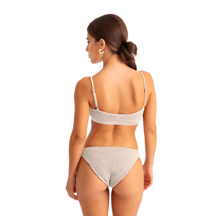 •Smock textured bandeau style top with adjustable straps. •Classic bikini bottom. •Smooth stretch lining for extra comfort. •Removable push up paddings.