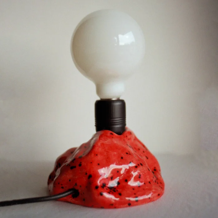 Hand-sculpted, glazed ceramic and flag red with black dots, table lamp.