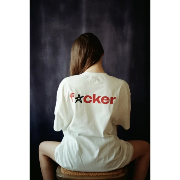 "f*cker" on the rear, printed t-shirt.round neck.made of %100 cotton fabric.oversize.