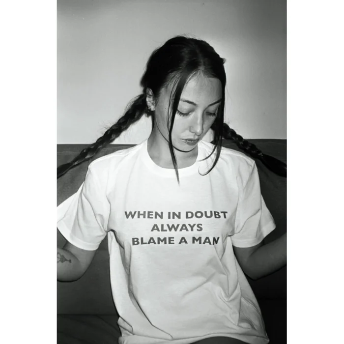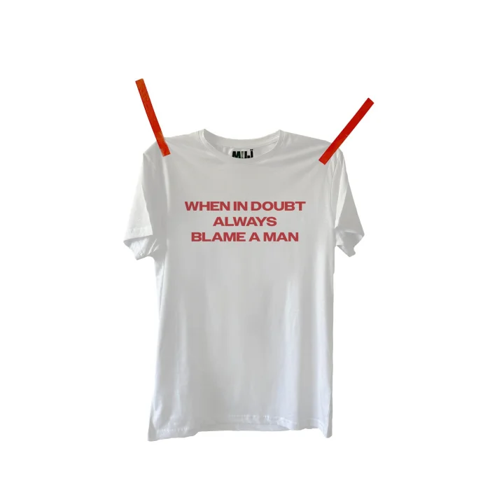 "WHEN IN DOUBT ALWAYS BLAME A MAN" printed t-shirt.round neck.made of %100 cotton fabric.regular fit.