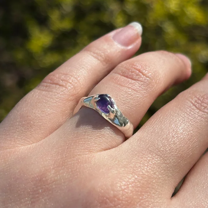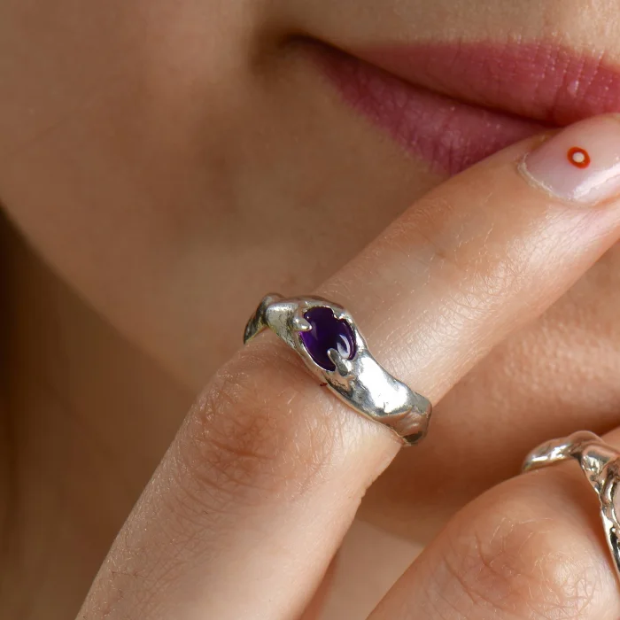 Handmade ring with a combination of 925 sterling silver and natural stones (lapis lazuli, malachite, amethyst and pink quartz). Size: 13
