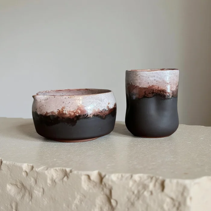 The kurotsuchi matcha set reflects the strong and simple spirit of the black earth. Each piece is handmade and only 1 piece was produced. "Kurotsuchi" means "black earth" in Japanese. This set was inspired by the deepest tones of the soil and the unique textures of nature. The crimson and grey transitions on a dark matte black background resemble layers of volcanic terrain. It presents the inner power of nature in a simple form. Each ceremony invites you to your roots. Features of Kurotsuchi Seti: • It is completely handmade. • The parts are individually shaped on a lathe and finished with special glazes. • Only 1 piece was produced. The same is not done. Set Contents (2 Pieces): • 1 matcha bowl (chawan) • 1 tea glass (yunomi) Optional: • 1 bamboo spoon (chashaku) • 1 bamboo beater (chasen) How to use? Put the matcha powder in the chawan, add the hot water, and quickly beat in a "W" shape with a bamboo beater. When foam forms, it is ready. Place your whisk on its stand, pour it into your cup, and sip the peace of the earth. Note: Surface differences due to handmade production are natural and add character to each piece.