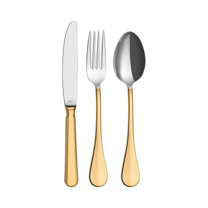 Baguette Series - Gold - 18 Piece Cutlery Set; Product features: ; It is made of 18/10 Cr-Ni stainless steel. ; It is resistant to corrosion. ; It is covered with real gold dust. ; It can be washed in the dishwasher, but it should be used more carefully than daily used products. Extra chemicals should not be used in dishwashers, except for standard detergents. ; 18 Pieces Cutlery Set includes: ; 6 tablespoons, ; 6 pieces of food cutlery, ; 6 knives for food;