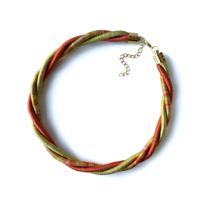 Silk threads dyed with natural dyes, cotton ropes, gold-plated brass accessories were used.