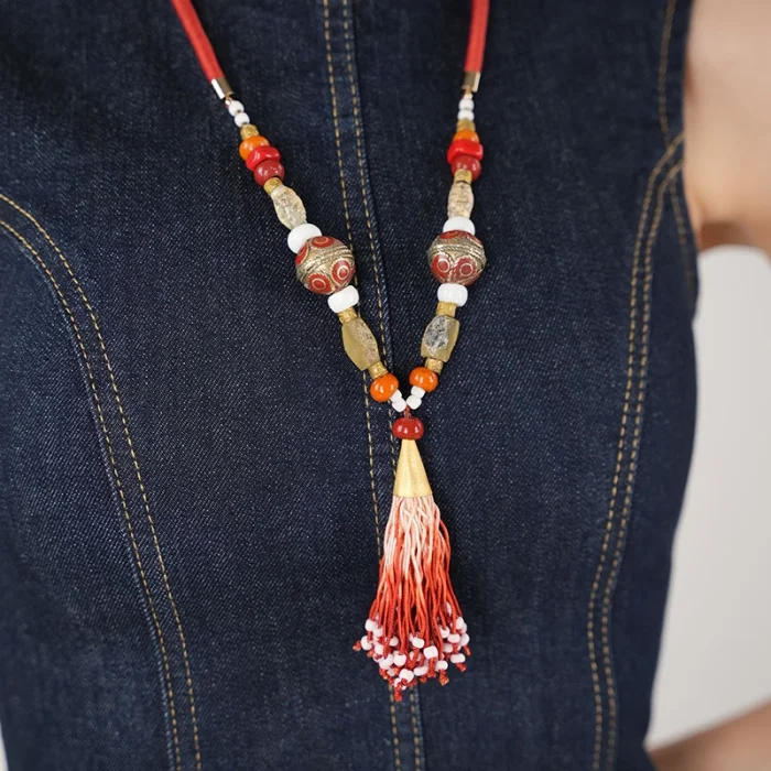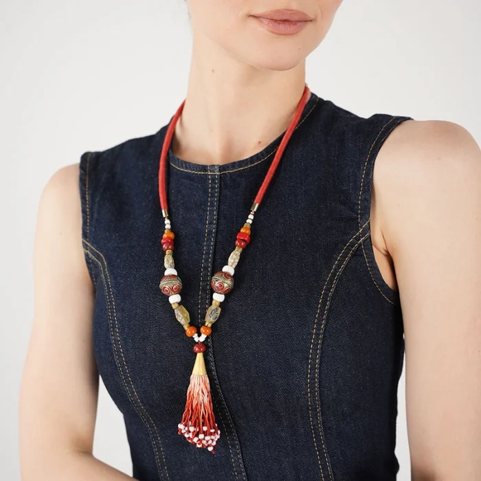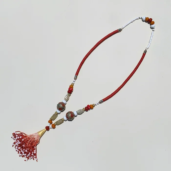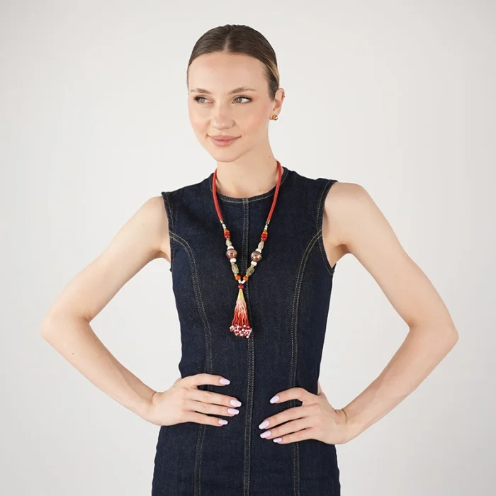 It is produced with silk threads dyed with natural dyes, cotton ropes, gold-plated brass accessories, glass and stone beads.