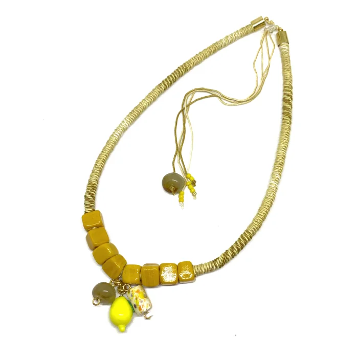 It is produced with silk threads dyed with natural dyes, cotton ropes, handmade glass and ceramic beads and gold-plated brass accessories.