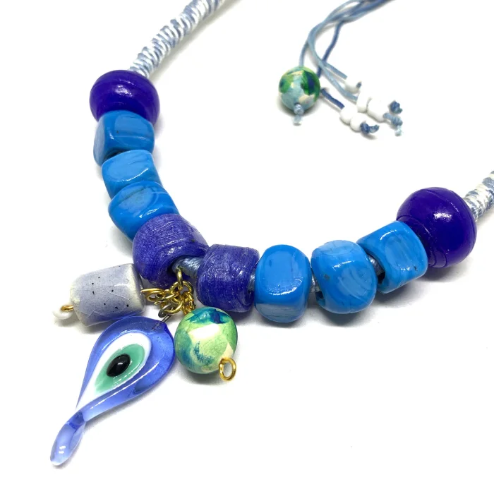 It is produced with silk threads dyed with natural dyes, cotton ropes, handmade glass and ceramic beads and gold-plated brass accessories.