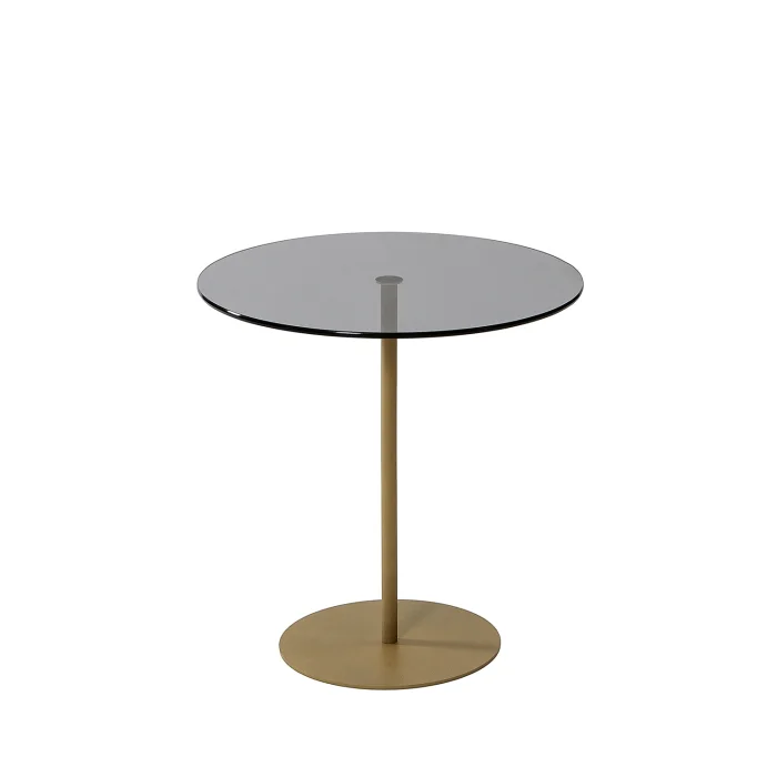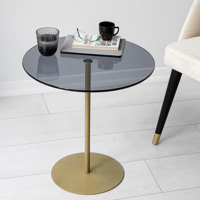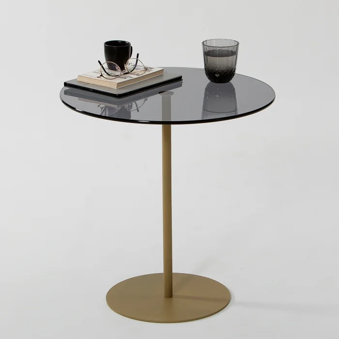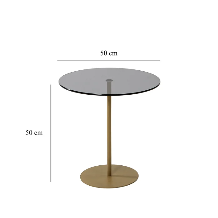 - Width: 50 cm. Height: 50 cm. Depth: 50 cm. • Table leg material is metal. It is gold in color. Painted with electrostatic powder/ oven paint. Does not rust, does not peel. • Tempered smoked glass is used. • Tempered glass; It is a safe glass that is resistant to impacts and breakage, has high strength, and does not create any danger when broken. The resistance of normal glass is increased by subjecting it to heat treatment with advanced technology. When tempered glass is broken, it breaks into small blunt pieces. Therefore, it does not pose a danger to human health and safety, it is safe. • Materials suitable for environment and health are used. • First quality connection and accessory materials are used. • It is domestic production with 100% domestic material.