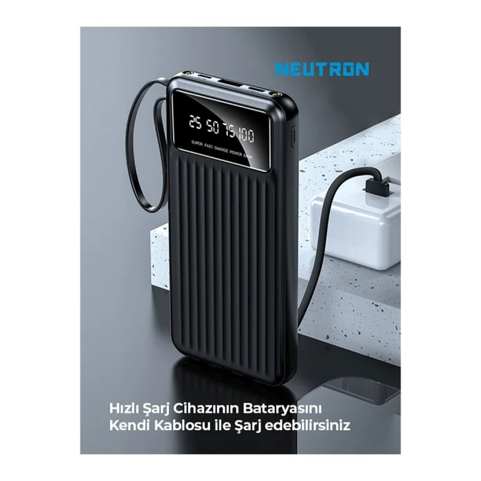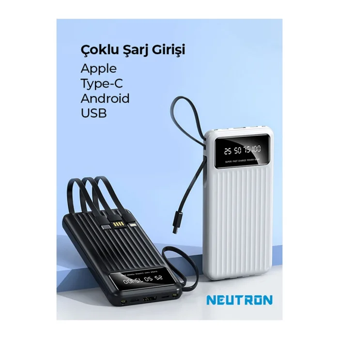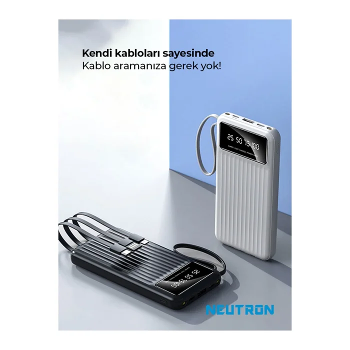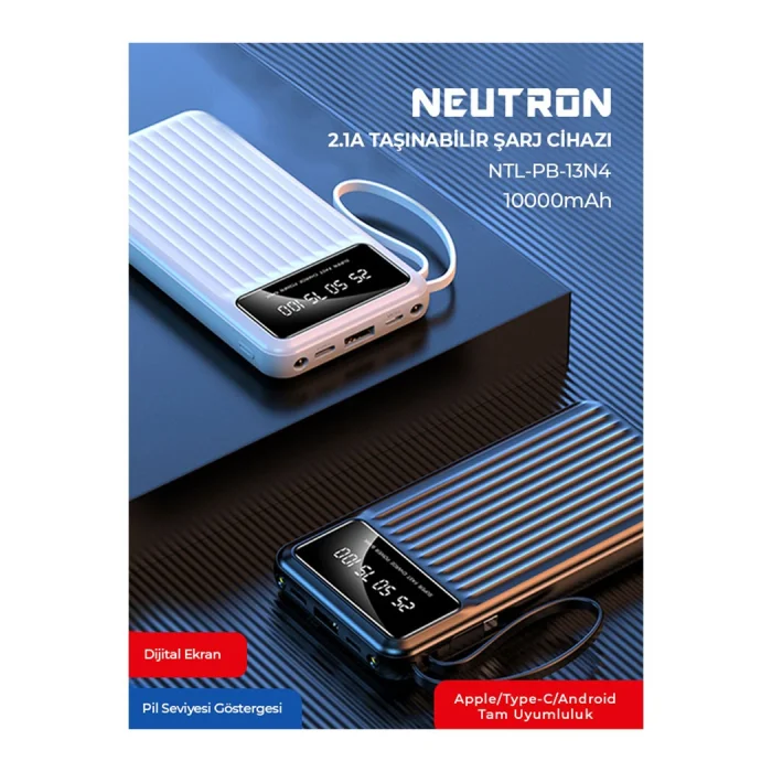 Radiant Energy at All Times: Neutron 10,000 mAh Wired Digital Display Flashlight Powerbank Meet the Neutron 10,000 mAh Wired Digital Display Flashlight Powerbank to meet your energy needs anytime and anywhere in the mobile lifestyle brought by technology! This powerful powerbank is always with you with its high capacity, practical use and extra features. Salient Features: High Capacity: The 10,000 mAh capacity offers enough power to charge your multiple devices. ; Flashlight Feature: The built-in LED flashlight provides illumination in case of emergency, providing ease of use during night rides or power outages. ; Digital Display: It provides convenience to the user with its digital display to precisely monitor the power level. ; Wired Charging & Multi-Connection: Compatible with a wide range of devices with Type-C, Lightning and other wired connections. ; Product Content: Neutron 10.000 mAh Wired Digital Display Flashlight Powerbank; Type-C and Lightning Charging Cables; Radiate Light with Your Energy at Every Moment! Neutron 10,000 mAh Wired Digital Display Flashlight Powerbank provides strong support for any time of the day. With its high capacity, it quickly charges your phones, tablets or other portable electronic devices, while it lights you up in emergencies with its built-in LED flashlight. It's now easy to track power with its digital display! Meet this powerbank full of energy to always stay in the light, add power to your life!