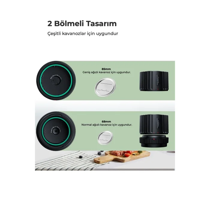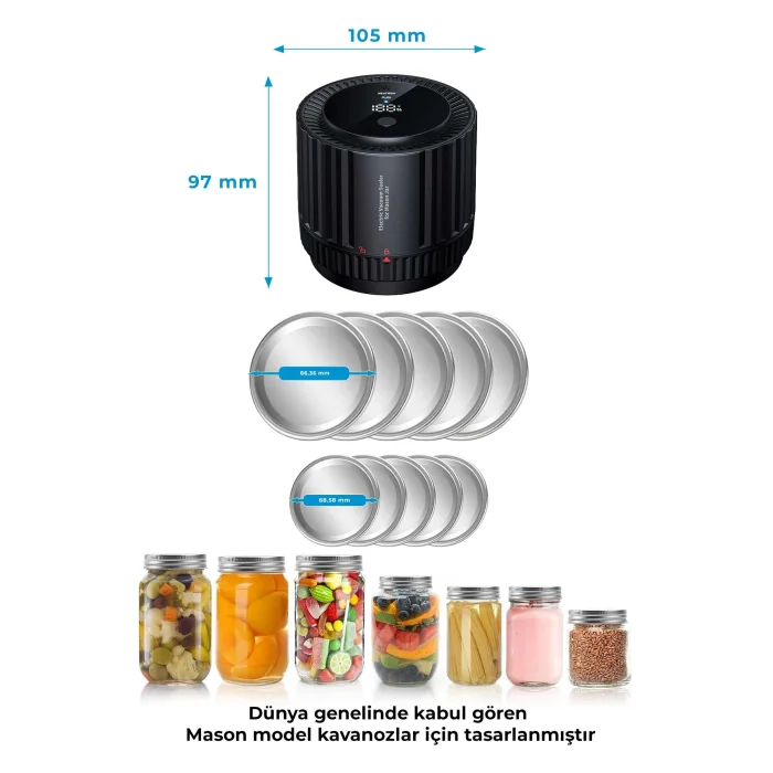 The New Way to Keep It Fresh Neutron extends the shelf life of food in your home with its innovative vacuuming technology. Thanks to its practical design, it can be easily used in every home. By vacuuming your food in just 30 seconds, you can preserve their freshness and avoid waste. Enjoy saving money and keeping your leftover food fresh for longer. Product Features: Economical and Environmental; The Vacuum Jar Lid Sealing Machine helps you save money and act in an environmentally responsible way by preventing food waste. You will no longer have to throw away spoiled food. Hygienic and Safe; It ensures that your food is stored in a hygienic environment. It destroys the bacteria in the air that may leak into the mouth of the jar during the vacuum sealing process. Technological Superiority; Thanks to its state-of-the-art vacuum suction system, it reduces the contact of your food with oxygen by removing the air in the jar. Thus, your food stays fresh for longer and retains its flavor. easy operation; With its user-friendly design, it is designed so that anyone can use it easily. The machine, which can be operated with a simple button, performs vacuum closing quickly and efficiently. It also comes with a multi-jar head, which is suitable for different sizes of jars, so you can use it to suit your various needs. rechargeable; It makes a difference with its strong suction power, fully automatic and fast operation feature. In addition, thanks to its USB charging design, it can be used wirelessly, it is portable and its lightweight structure does not take up extra space. Neutron Vacuum Jar Lid Sealing Machine will be indispensable for your kitchens with its excellent performance, user-friendly design and advantages. Discover a new and effective way to keep your food as it is fresh, enjoy a life full of flavor with the Neutron Vacuum Jar Lid Sealing Machine! The vacuum jar sealing machine designed for Mason model jars, which is accepted worldwide, preserves food in a fresh and healthy way, ensuring that it lasts for a long time. Technical Specifications: Model ? NTL- SV-15S; Charging power ? USB Type-C 5V/1A; Power?? 5W; Material? ABS, Silicone; Weight ?348g; Size?105*105*97; Box Contents: Machine 1 pc; Normal port converter 1pcs; Type-C Charging cable 1pcs; Manual 1 pc.; Bottle opener 1 pc.; Wide-mouth cap 5 pcs.; Regular mouth mask 5 pcs.;