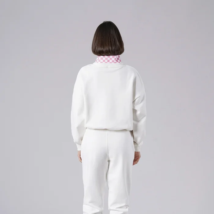 Elastic waist sweatshirt with “Nonsénse” embroidery on the front with a checked pattern on the collar. Model wears size S.