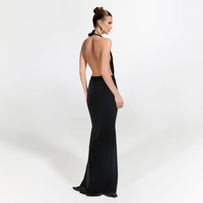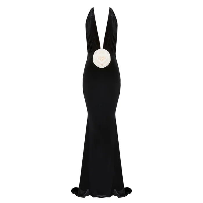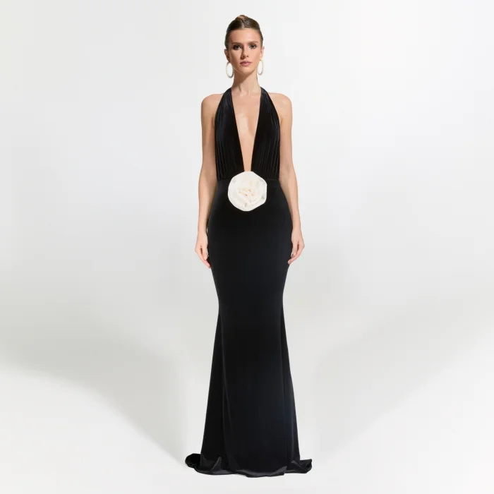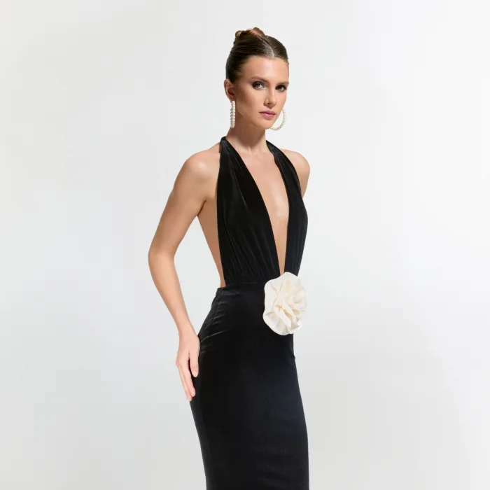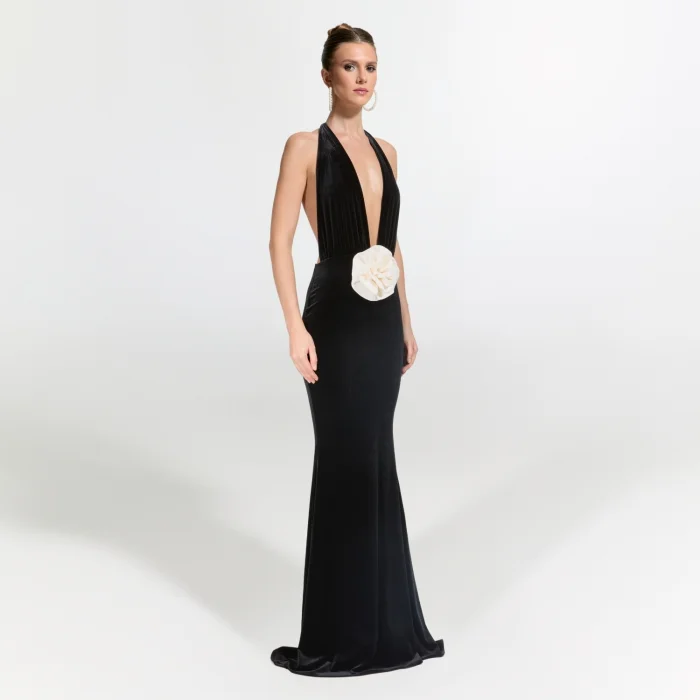 >Alhambra Gown combines elegance and elegance with its deep V-neck design and low-cut back, while the large flower detail at the waist adds a feminine touch to the dress. While it offers freedom of movement thanks to its short cut, it highlights your elegance with its draped design that emphasizes body lines.