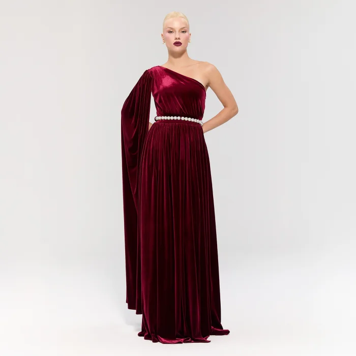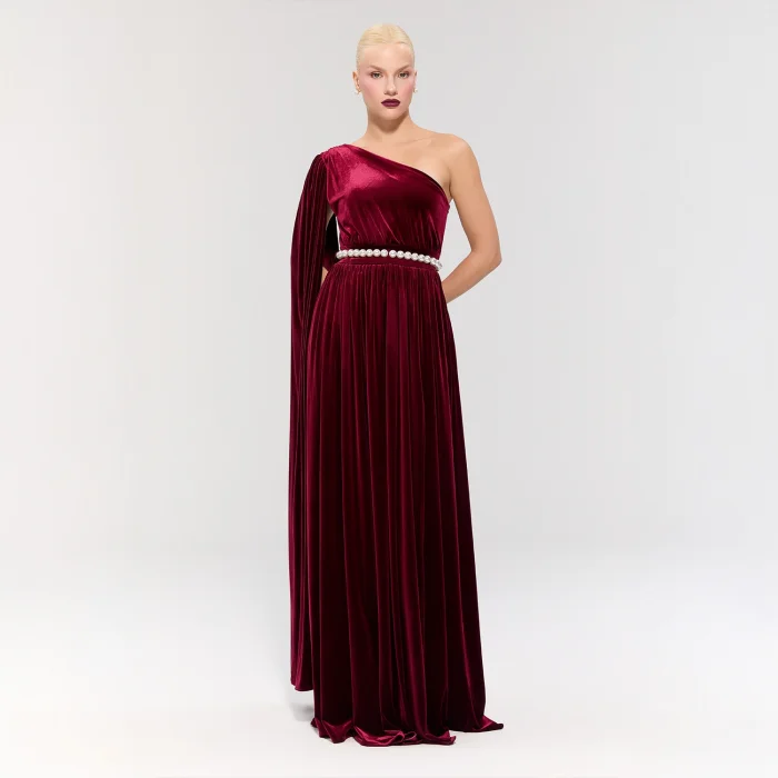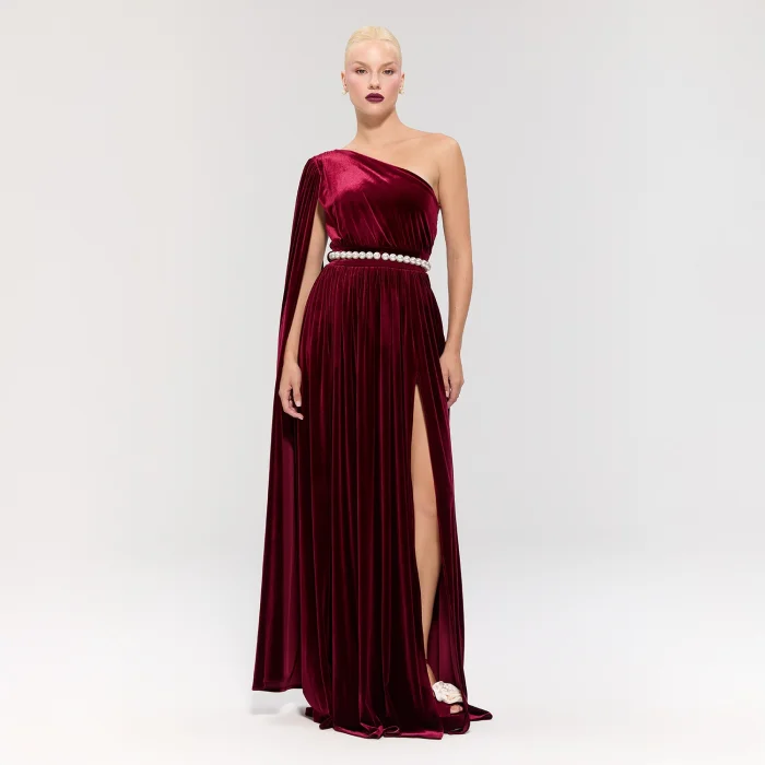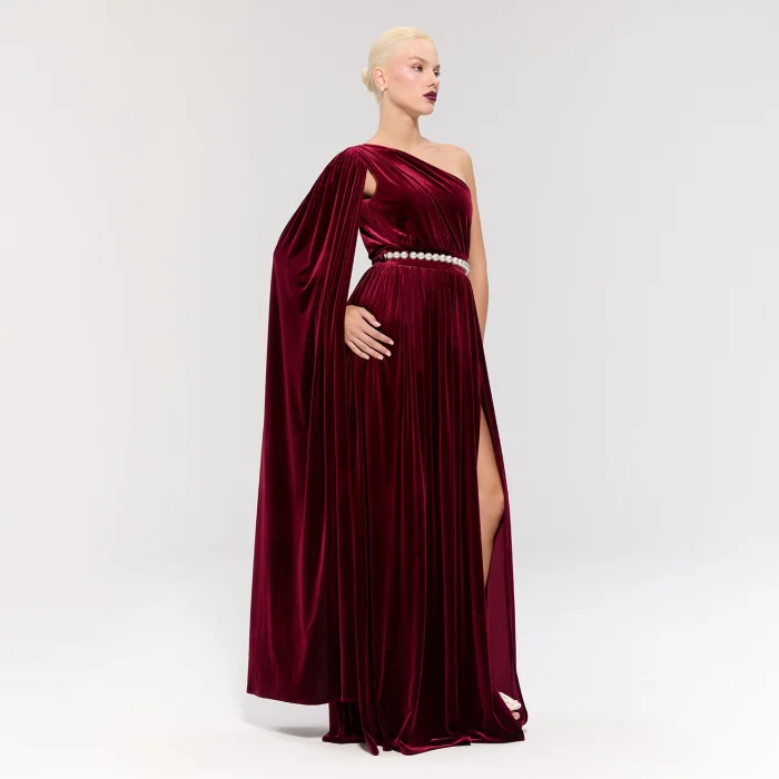 The burgundy velvet dress features a one-shoulder long cape and a pearl belt for a sophisticated, elegant look.