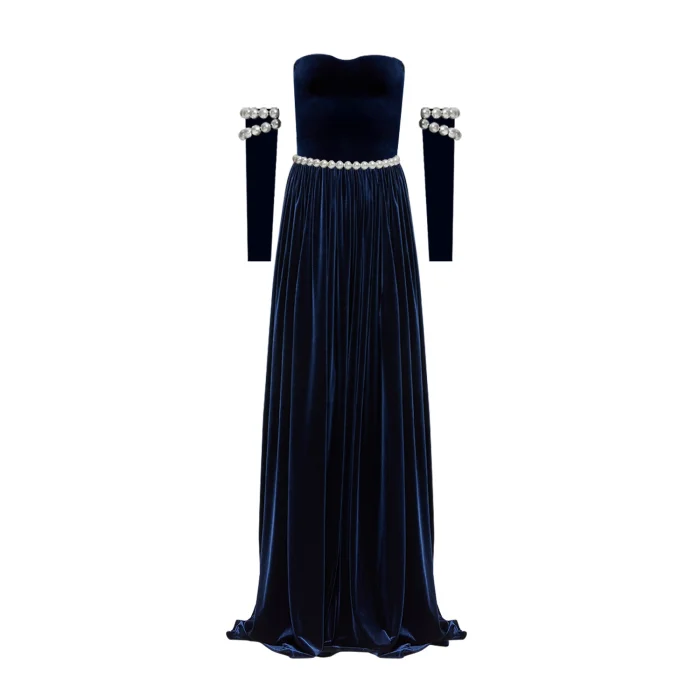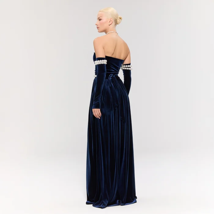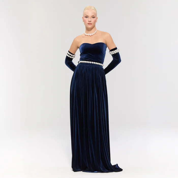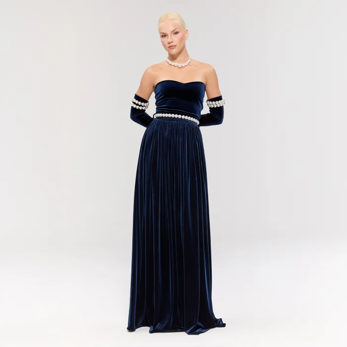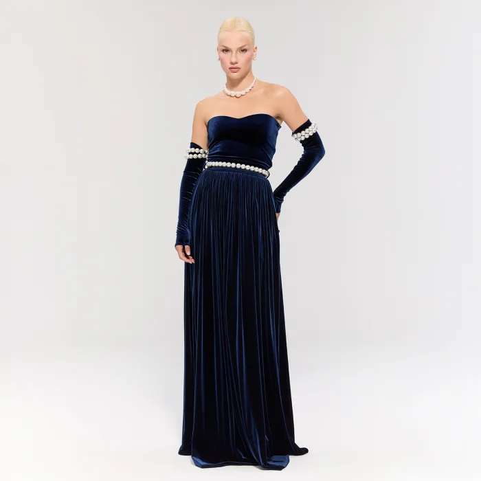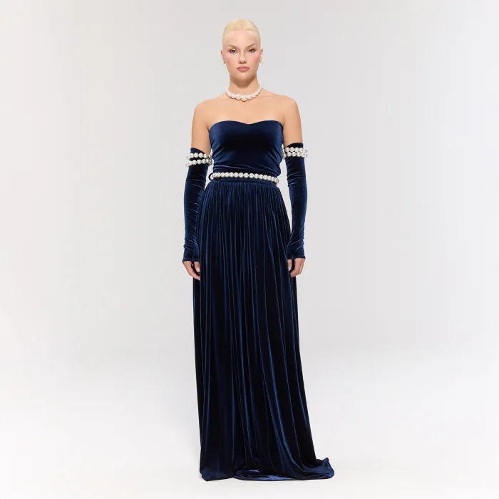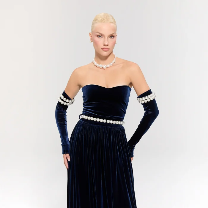 The long navy velvet dress offers an elegant silhouette. Pearl details on the sleeves add grace, while the pearl belt brings a sparkling touch.