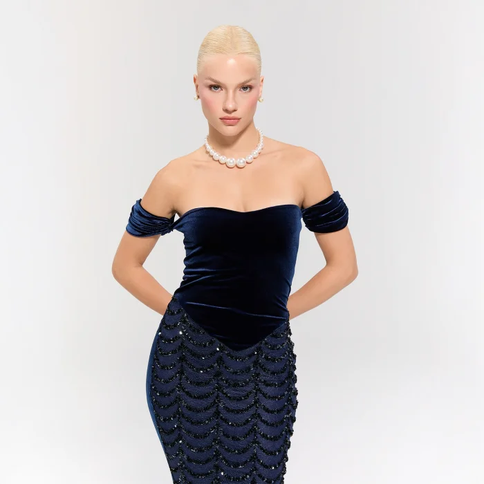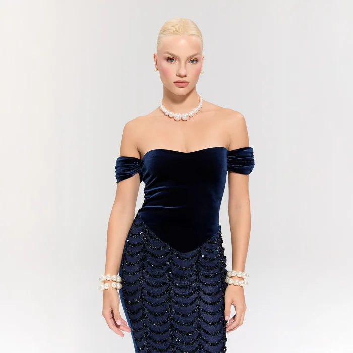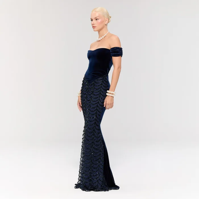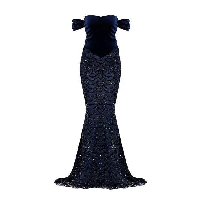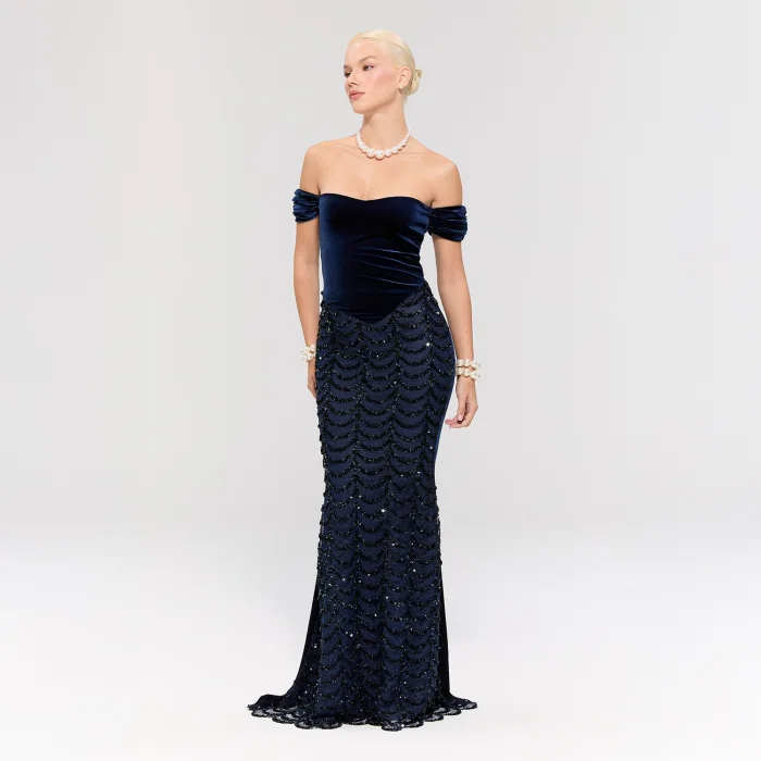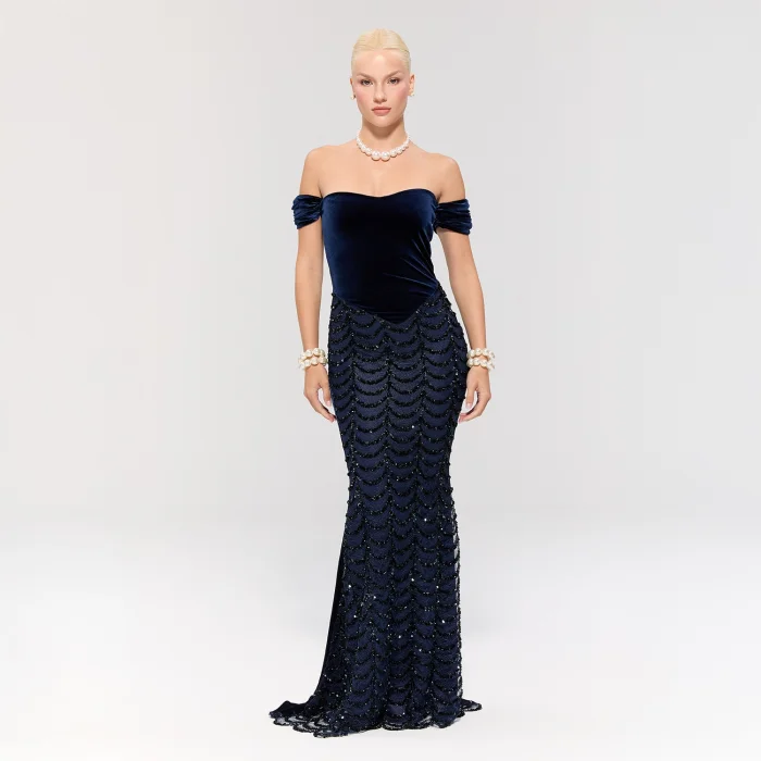 The dress features a navy velvet top for elegant sophistication and a sequin long skirt with a fitted silhouette for a striking look.