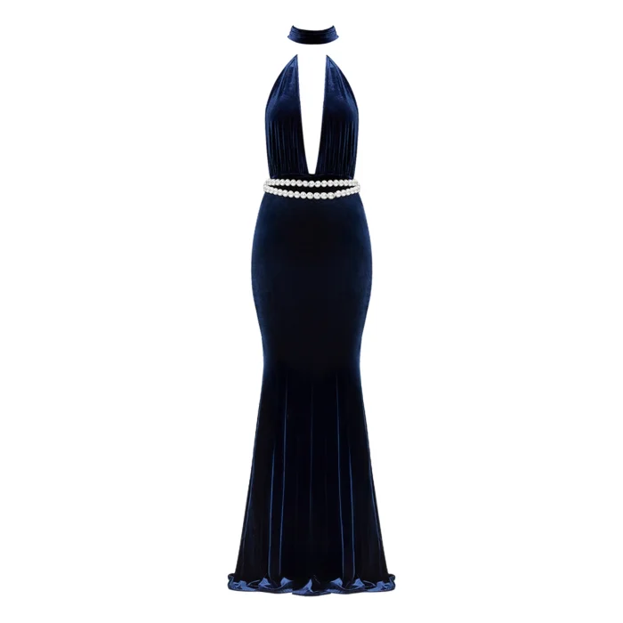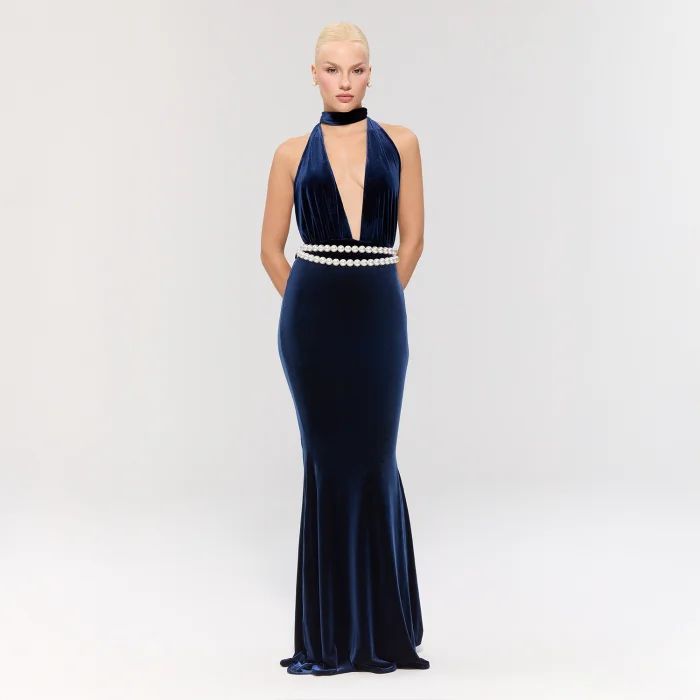 The navy velvet dress features a deep V-neck tie for a feminine silhouette, with a pearl belt adding a delicate sparkle.