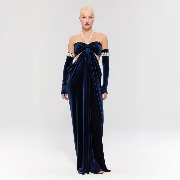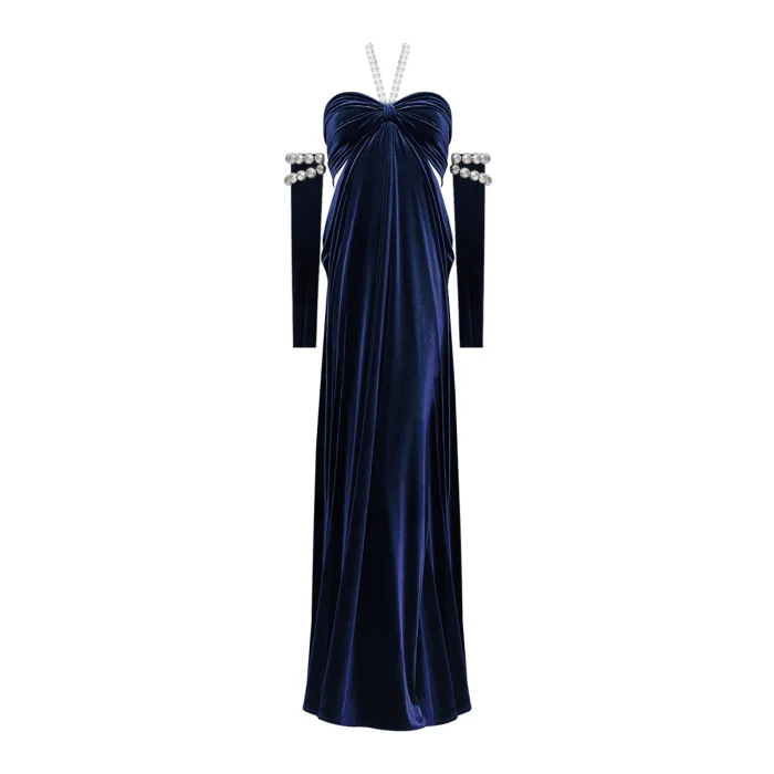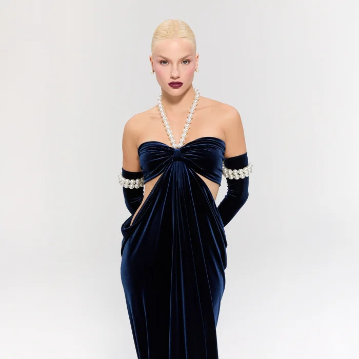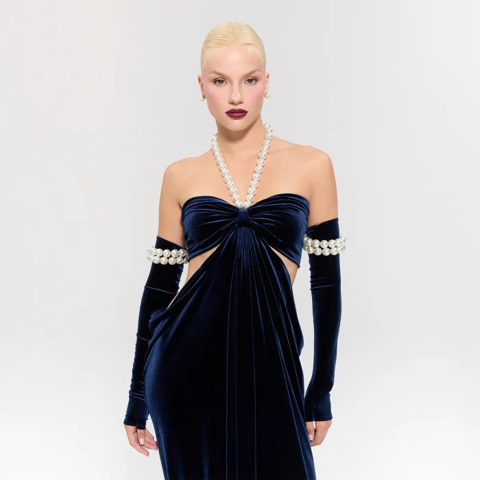 • The dress offers sophisticated elegance with its navy blue velvet fabric.