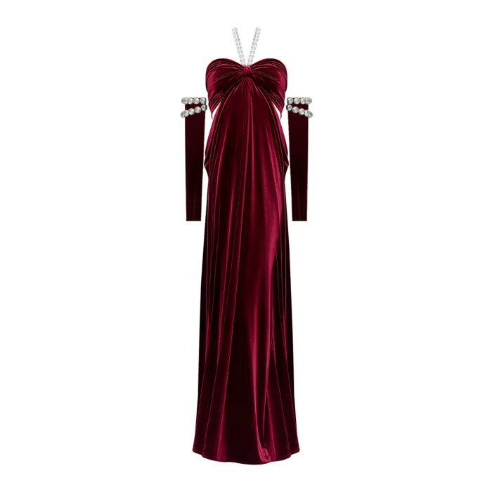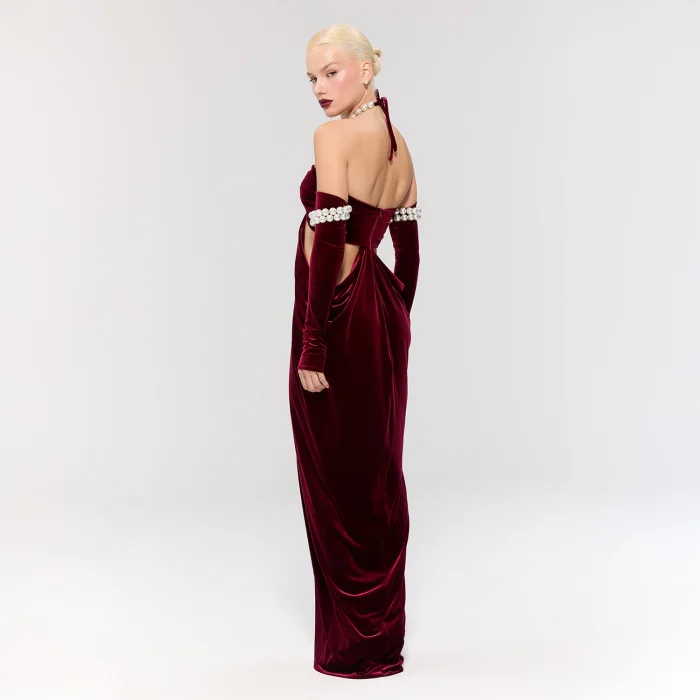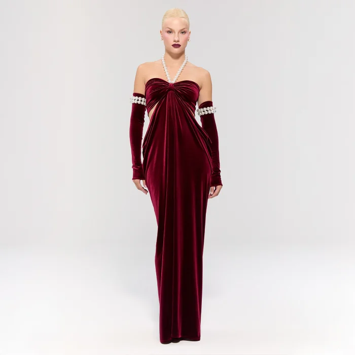 The dress offers sophisticated elegance with its burgundy velvet fabric.