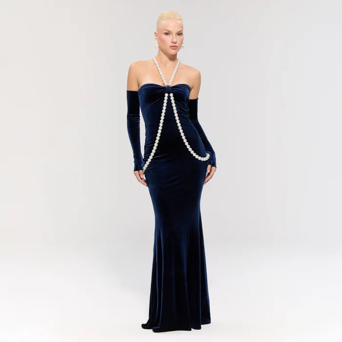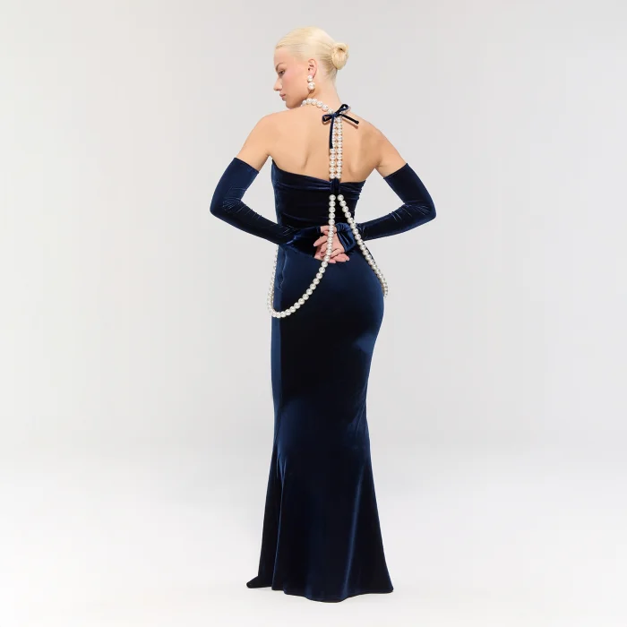The navy velvet dress features a pearl neck tie and side embellishments, with long pearl gloves completing the look.