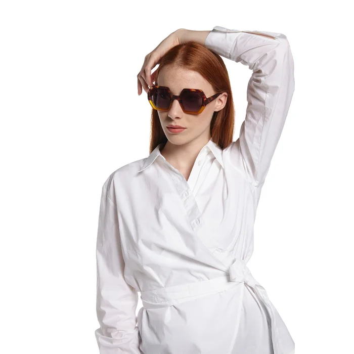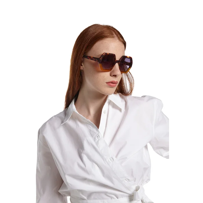 EMMA is a pre-assembled hexagonal sunglasses with a soft-touch frame and overlapping lenses. Gradient lenses are characterized by the fact that the dark color at the top of the lens changes to a lighter color towards the bottom of the lens. Sunglasses with gradient lenses are very convenient for driving, you can easily look at the dashboard from the lighter part, while the upper half of the lens protects you from glare! Okkia's stylish and affordable Italian sunglasses are extremely comfortable thanks to their light weight and soft-feeling frames. It is designed to easily adapt to any face, allowing you to wear it for long periods of time. Meets the relevant European standards for category 3 light filter lenses with UV 400 protection (8% - 18% transmittance).