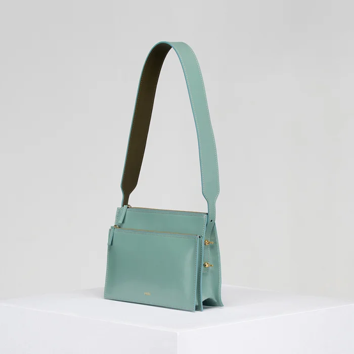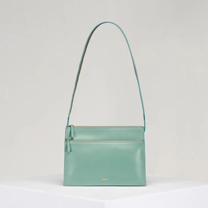 Vegetable tanned blue calf leather shoulder bag. Two-compartments with gold-tone zippers, four gold-tone butterfly screws and onz logo at face. The blue strap is olive on the other side and is attached with the four butterfly screws. The strap is adjustable and detachable by the screws, and can be switched out.