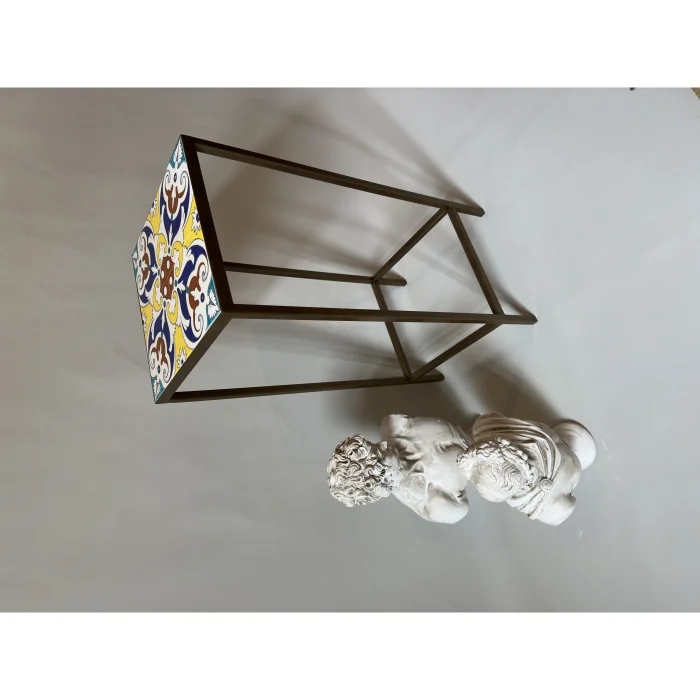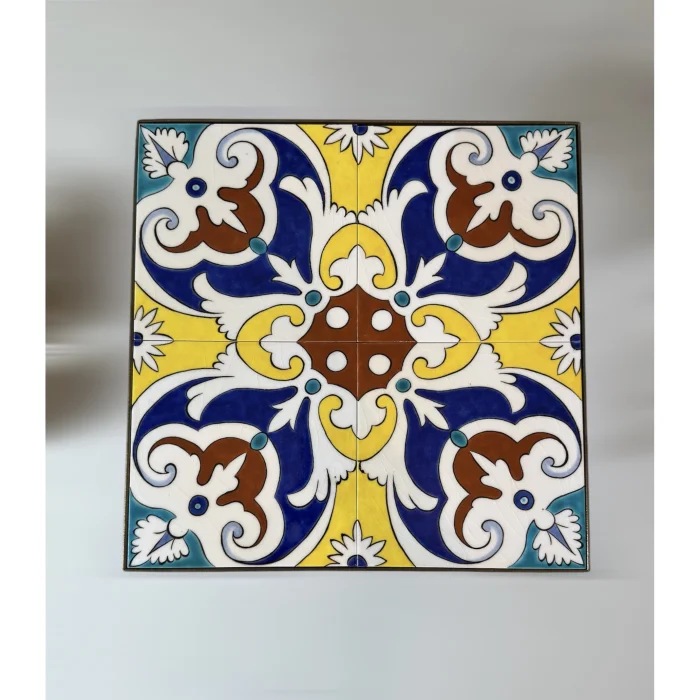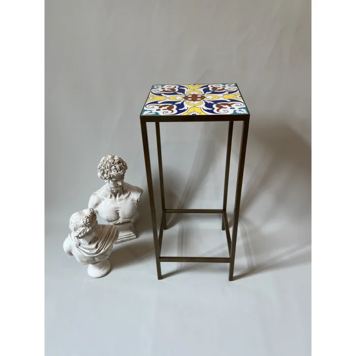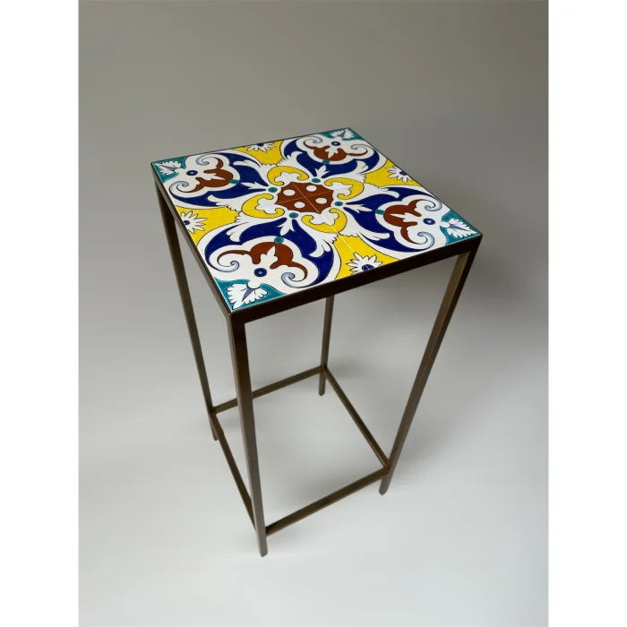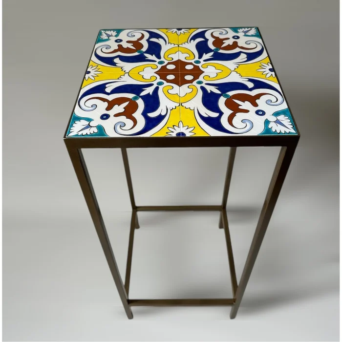 Our table, designed with handmade ceramic tiles, has a 30x30 cm base and a height of 70 cm.