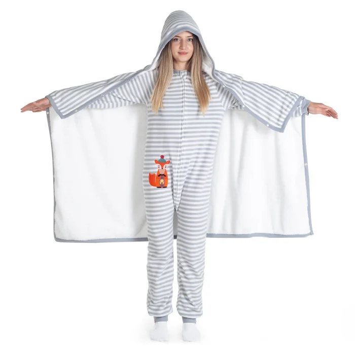 Owli Wearable Blanket Owli Wearable Blanket is designed for children to start the day easily and not to worry about what to wear. Owli is very easy to use, children can easily throw the Owli Wearable Blanket on their shoulders, which is light and fluffy, as soon as they get out of bed or enter the house. Children who want to start their day as superheroes can use it as a cape, and children who want to get to work immediately can use it as a wearable blanket with snap sleeves. We also have good news for parents who envy this comfort that their children experience. Owli presented its first adult product to parents with a wearable blanket. So you can enjoy the comfort and warmth of Owli all day long, whether you're working with a laptop or doing household chores. - High quality-double-sided fleece fabric. -Hooded - With its snap sleeves, you can use it as a cape or as a wearable blanket. - Suitable for all-day use. - For both children and adults. - Light and soft fabric. Easy to maintain as well.