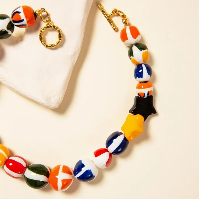 All pieces are made from air dry clay. All beads and patterns are hand made. The metals used in the clips are gold plated. Measurements are approximate and can slightly differ for each piece.